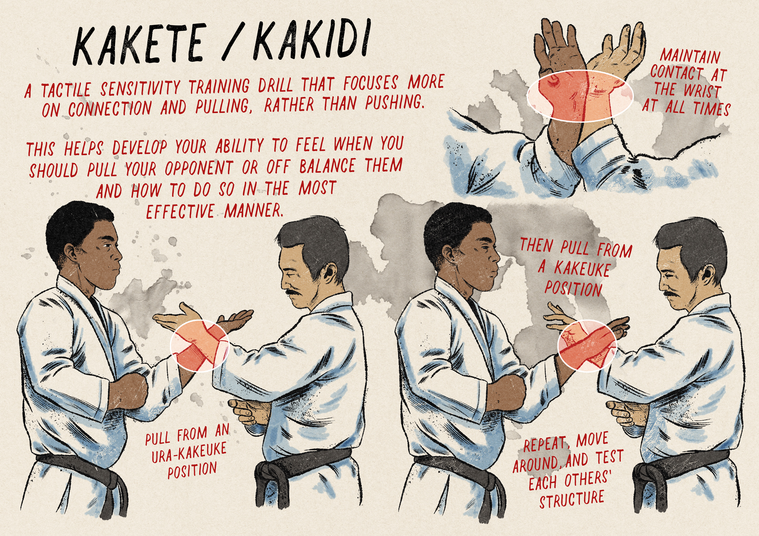 Kakie tends to focus more on giving and receiving energy. Kakete helps you understand how to get in control and to decide what to do once you are. Being able to uproot your opponent, manipulate their limbs, and pull them off balance is a very useful skill when it comes to close range fighting. Many joint locks and manipulations can be tested and practiced while you are drilling Kakete with a partner.
